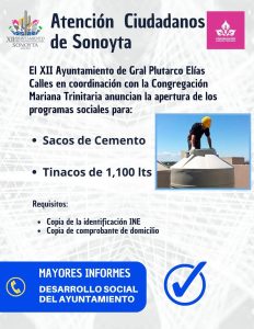 El XII Ayuntamiento de Gral. Plutarco Elías Calles, en coordinación con la Congregación Mariana Trinitaria, informa la apertura de programas sociales para apoyar a las familias del municipio con: