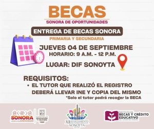Atención solicitantes de becas Sonora de Oportunidades para Primaria y Secundaria, este jueves 4 de septiembre se estarán entregando en las instalaciones del DIF Municipal de las 9 de la mañana a las 12 del mediodía.