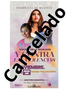 Por causas ajenas a nuestra organización, el evento denominado “Voces por la igualdad y contra la violencia” programado para el próximo sábado 8 de noviembre, se cancela hasta nuevo aviso. Por su comprensión, gracias.