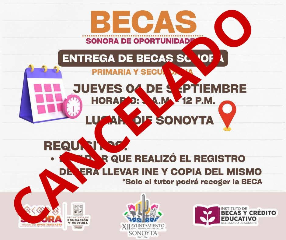 Debido a que se espera mal tiempo durante los horarios programados para la entrega de becas anunciada para mañana jueves 4 de septiembre en las instalaciones del DIF Municipal, se cancela este evento posponiendolo para una nueva fecha próxima a anunciarse. Agradecemos su comprensión y les pedimos estar atentos a la nueva cita.