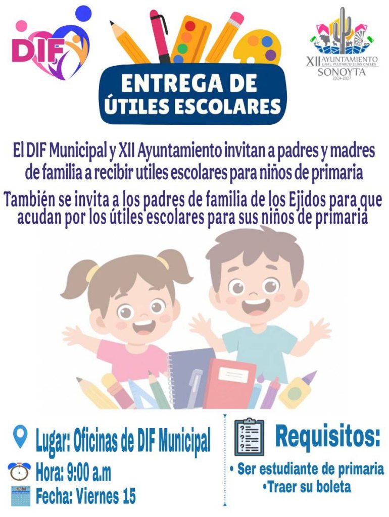 El DIF Municipal y el XII Ayuntamiento tienen el gusto de invitar a todos los niños de primaria a la entrega de útiles escolares. Fecha: Viernes Hora: 9:00 AM Lugar: Instalaciones del DIF MunicipalRequisitos:Traer su boleta de calificaciones¡No faltes! Apoyando la educación de nuestros niños