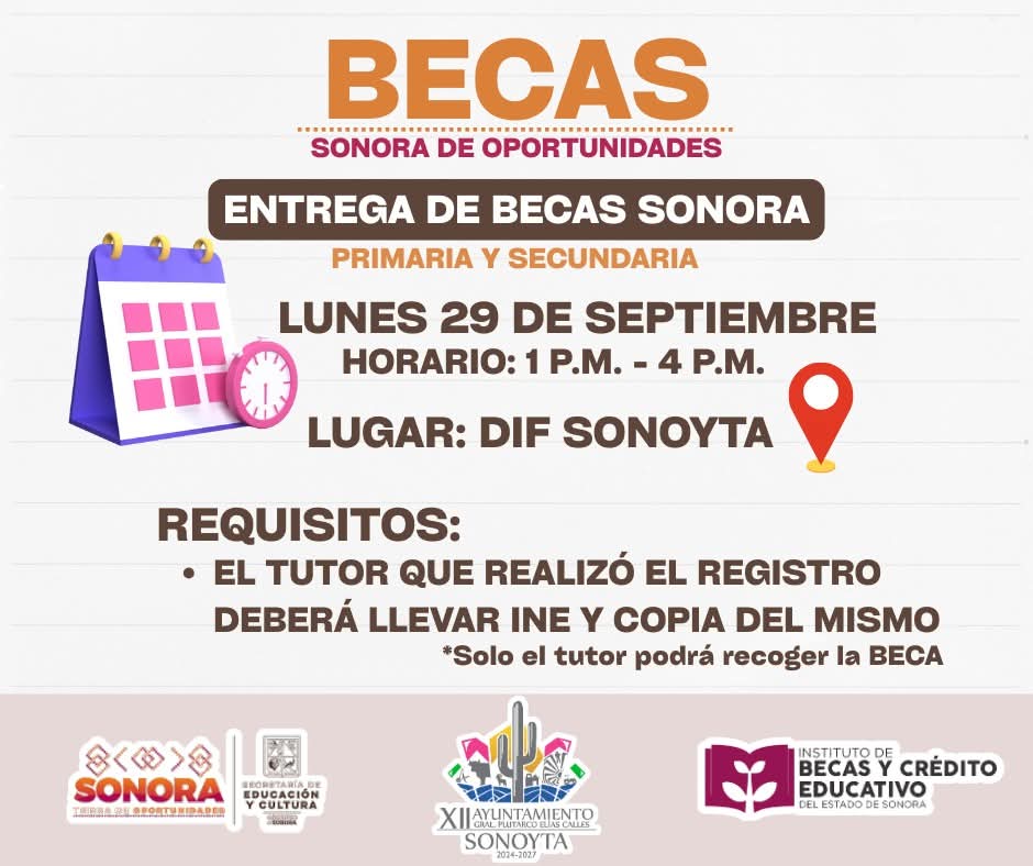 Hoy lunes 29 de septiembre, entrega de becas. De 1 a 4 de la tarde en las instalaciones del Dif Municipal del XII Ayuntamiento Sonoyta
