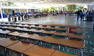 Donación de 86 mesabancos que beneficiarán a alumnos de la Primaria Lic. Benito Juárez y la Primaria Miguel Hidalgo y Costilla.