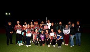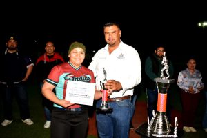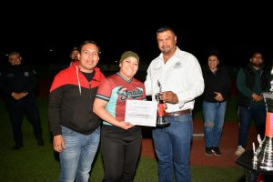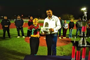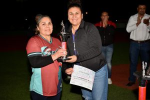 Entregamos reconocimientos y trofeos a la Pitcher Campeona por sus números en el rol regular Laura Martínez, a Leticia García por su rendimiento como mejor bateadora y a Valería Valdez por jugadora MVP; todas del equipo Indias; y por supuesto el trofeo y reconocimiento a Indias y Muñecas, de campeón y subcampeón, respectivamente.