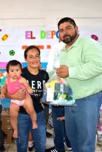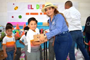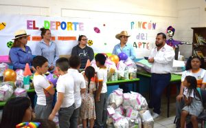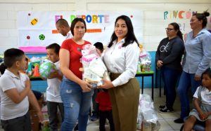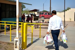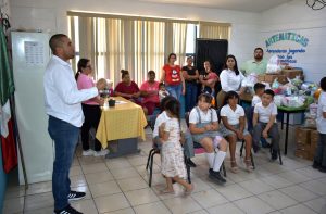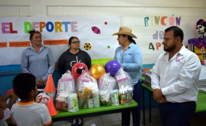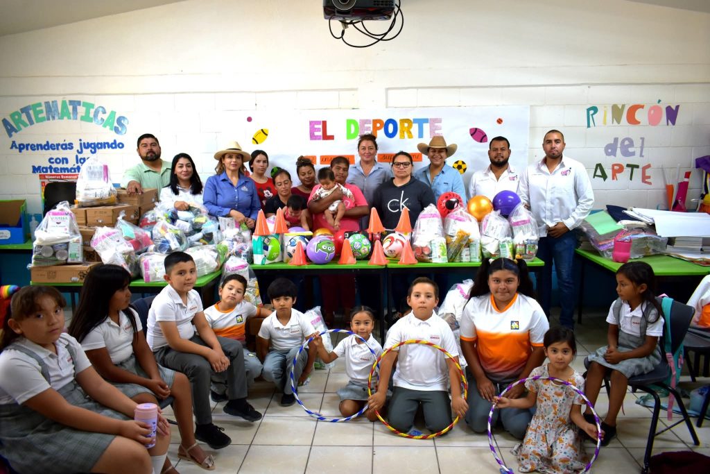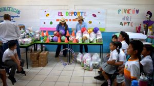 Allí se entregaron despensas, paquetes con leche, material para limpieza y despensas; así como diverso material deportivo en beneficio de los niños de la escuela y de los pobladores en general.