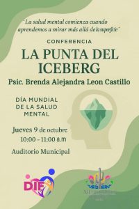 Invitación abierta a la conferencia sobre salud mental. Este jueves 9 de octubre en el Auditorio Municipal. Psic. Brenda León nos trae la conferencia “la punta del iceberg”