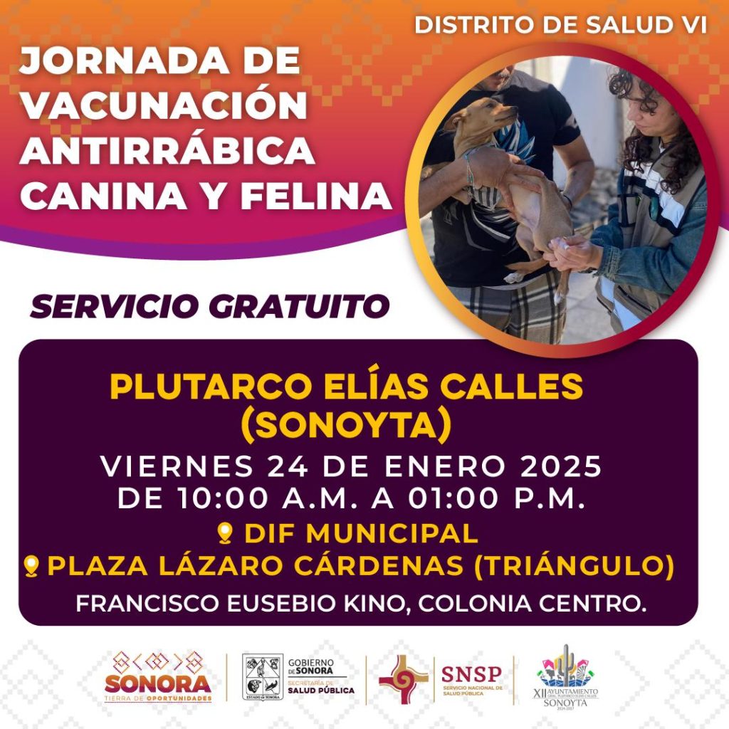 Atención sonoytenses con mascotas perrunas o gatunas. Para este viernes 24 de enero se dispondrá de dos puestos de vacunación: instalaciones del DIF Municipal y plaza el Triángulo.