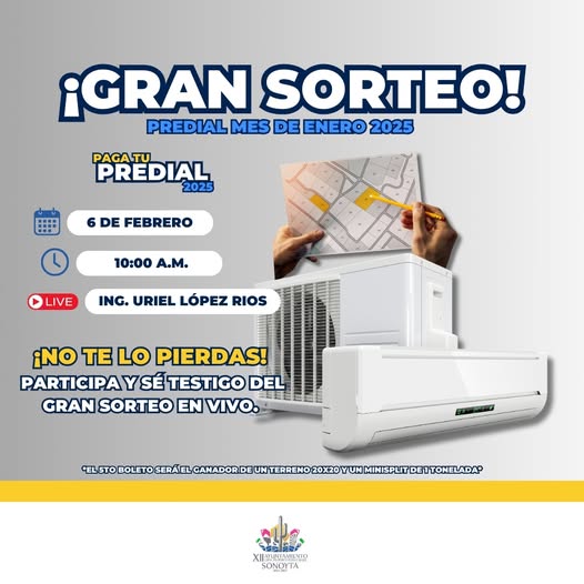 6 de febrero – 10:00 A.M.Transmisión en vivo en Facebook: Ing. Uriel López Ríos ¡El 5to boleto será el ganador de un terreno 20×20 y un minisplit de 1 tonelada! ¡No te lo pierdas! #Predial2025 #GranSorteo #CumpleYGana