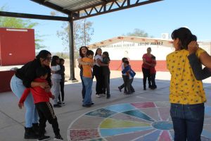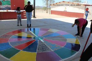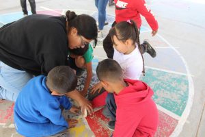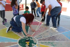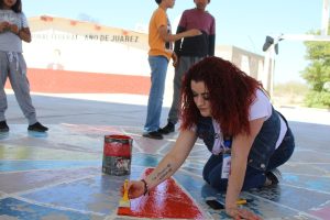 La Directora de Biblioteca Municipal, C. Rebeca López tuvo el acompañamiento también de la Lic. Diana Martínez Directora de Instituto de Juventud, la Lic. Danitza Rivera Directora de Casa de la Cultura y C. Mónica Valenzuela personal auxiliar de Biblioteca Municipal, quienes también aprovecharon para ayudar a pintar los tradicionales juegos de piso.