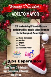 El XII Ayuntamiento y DIF Municipal tienen el honor de realizar una cordial invitación a todos los Adultos Mayores de nuestro municipio, para celebrar juntos una hermosa Posada Navideña preparada especialmente para ustedes.