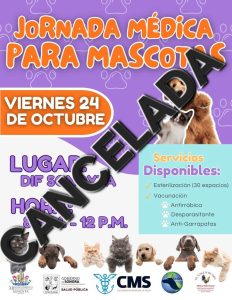 Por contratiempos del cuerpo médico de veterinarios, hemos tenido que cancelar la jornada médica de este viernes 24 y posponerla hasta nuevo aviso. Agradecemos su comprensión y paciencia. Pronto les avisaremos de una nueva fecha.